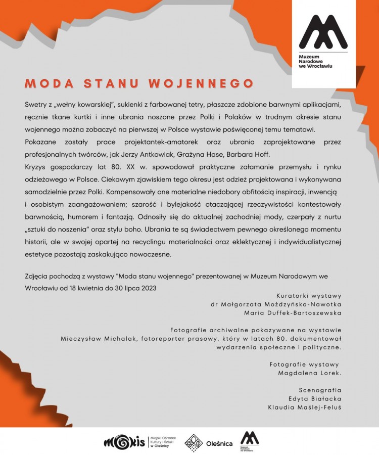- Z okazji 43. rocznicy wprowadzenia stanu wojennego serdecznie zapraszamy na wystawę plenerową pt. "Moda stanu wojennego" na oleśnicki Rynek, użyczoną przez Muzeum Narodowe we Wrocławiu - zaprasza Miejski Ośrodek Kultury i Sztuki w Oleśnicy.