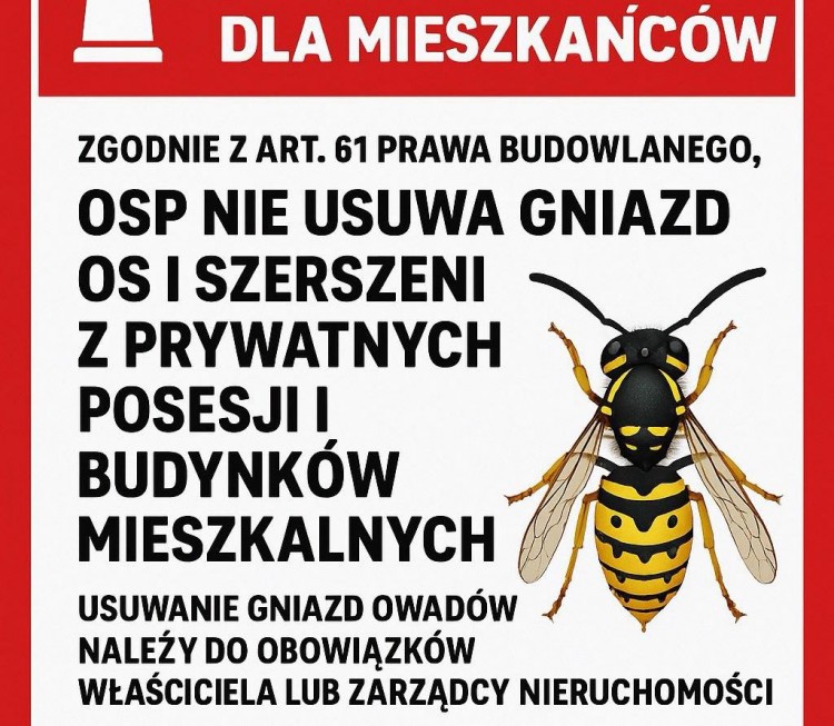 W związku z powyższym, informujemy, że OSP nie usuwa gniazd os i szerszeni z prywatnych posesji i budynków mieszkalnych. Usuwanie gniazd owadów należy do obowiązków właściciela lub zarządcy nieruchomości.