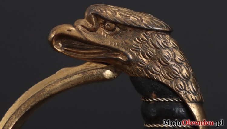 Szabla to elegancki egzemplarz z głowicą w kształcie orła i mosiężną rękojeścią ozdobioną czarnym drewnem oraz drucianym oplotem. Na jelcu znajduje się wizerunek pruskiego orła – symbolu monarchii. Ostrze z gładką, obustronną dekoracyjną rytą zachowało się w niezłym stanie, mimo drobnych śladów czasu.