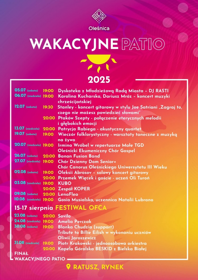 Szczegółowy harmonogram koncertów dostępny jest przy wejściu do ratusza, a także w mediach społecznościowych urzędu miasta oraz na jego stronie internetowej. Organizatorzy zachęcają do śledzenia zapowiedzi, bo - jak zaznaczają - każdy wieczór na patio to inne muzyczne doznania, prezentowane w kameralnej i przyjaznej atmosferze.
