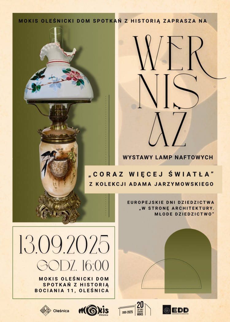 Miejski Ośrodek Kultury i Sztuki w Oleśnicy zaprasza na wernisaż wystawy lamp naftowych „Coraz więcej światła” z kolekcji Adama Jarzymowskiego, który odbędzie się 13 września 2025 roku o godz. 16.00 w Oleśnickim Domu Spotkań z Historią. Wydarzenie realizowane jest w ramach XXVIII Dni Europy oraz Europejskich Dni Dziedzictwa „W stronę architektury. Młode dziedzictwo”.