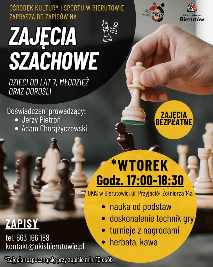 Ośrodek Kultury i Sportu w Bierutowie rozszerza swoją ofertę zajęć o spotkania szachowe. Organizatorzy zapraszają dzieci od siódmego roku życia, młodzież oraz dorosłych do udziału w bezpłatnych zajęciach, które odbywają się we wtorki w godzinach 17.00?18.30 w siedzibie OKiS przy ulicy Przyjaciół Żołnierza 14a.