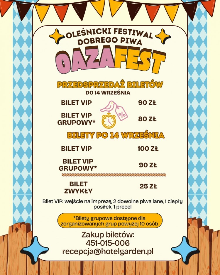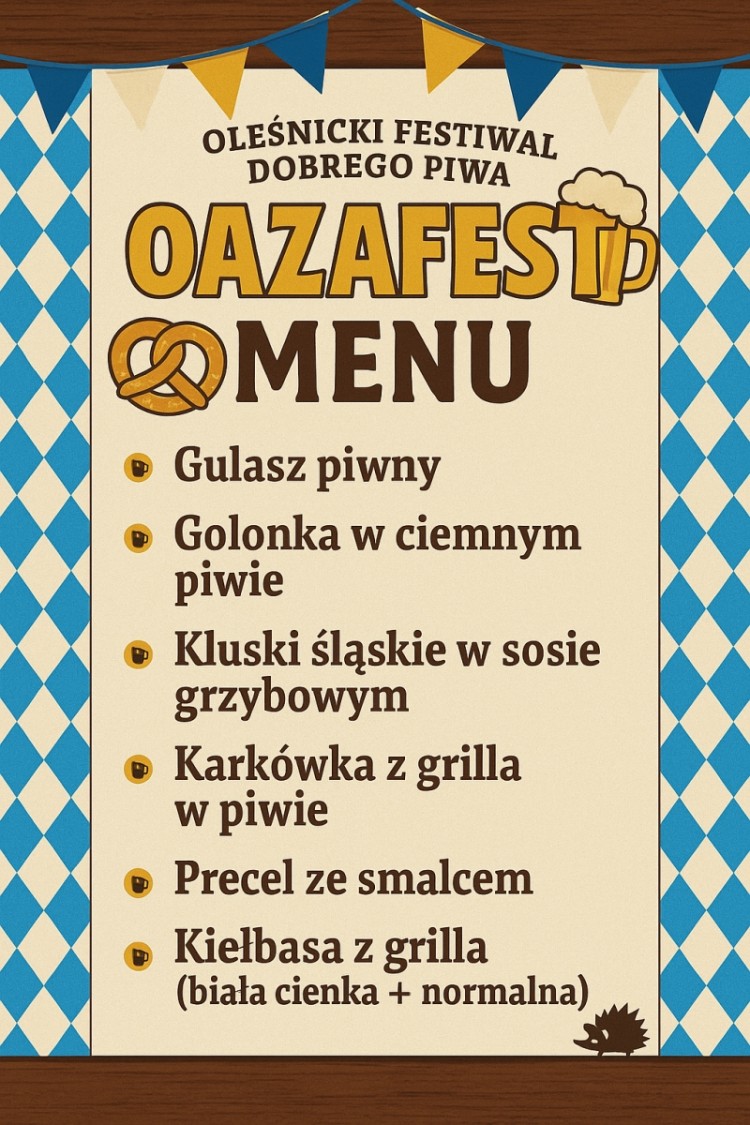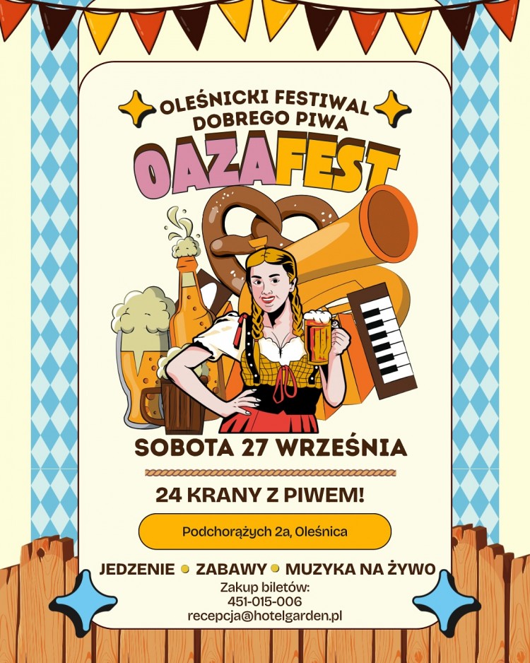 Oleśnica jeszcze nie widziała takiego wydarzenia! Już w sobotę, 27 września ogródek piwny Oaza zamieni się w wielką biesiadę w stylu Oktoberfest. To wieczór długich stołów, lampek nad głowami, wspólnych śpiewów i tańca – spotkanie, które tworzy klimat miasta. Na scenie Milicka Orkiestra Dęta, po niej DJ Marciz od 18:00. Stroje w stylu Oktoberfest mile widziane – dla przebranych upominki i gratisy.