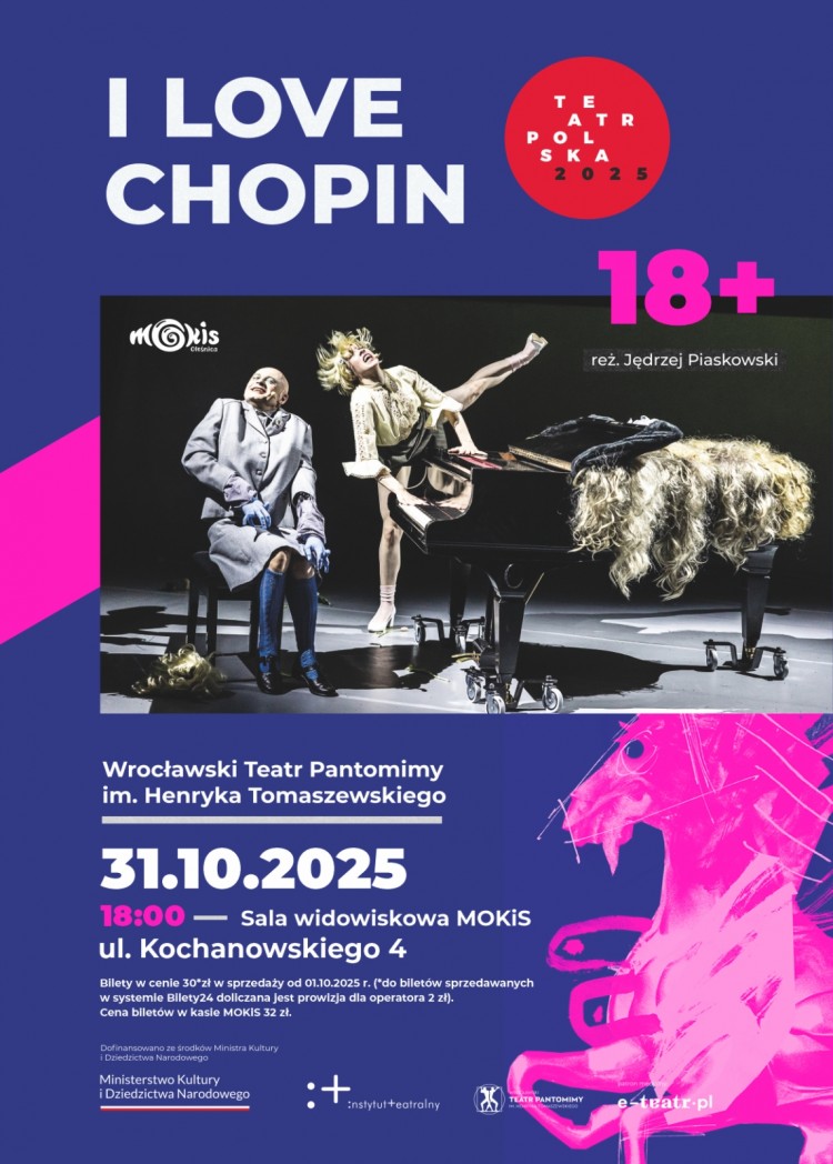 Miejski Ośrodek Kultury i Sztuki w Oleśnicy zaprasza na spektakl pt. "I love Chopin", który zostanie wystawiony 31 października o godzinie 18:30 w sali widowiskowej przy ulicy Kochanowskiego 4.