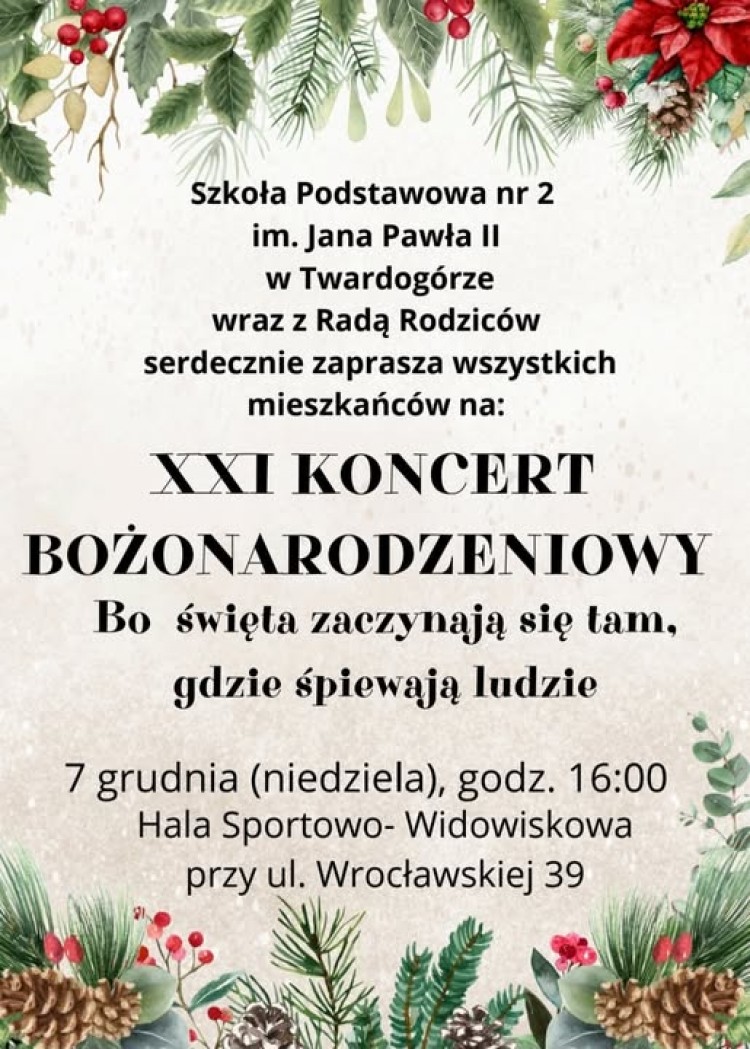 Szkoła Podstawowa nr 2 w Twardogórze wraz z radą rodziców zapraszają na XXI Koncert Bożonarodzeniowy.