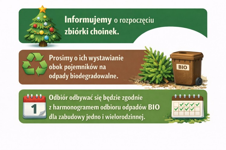 - Informujemy o rozpoczęciu zbiórki choinek. Prosimy o ich wystawianie obok pojemników na odpady biodegradowalne. Odbiór odbywać się będzie zgodnie z harmonogramem odbioru odpadów BIO dla zabudowy jedno i wielorodzinnej - informuje Miejska Gospodarka Komunalna sp. z o. o. w Oleśnicy.