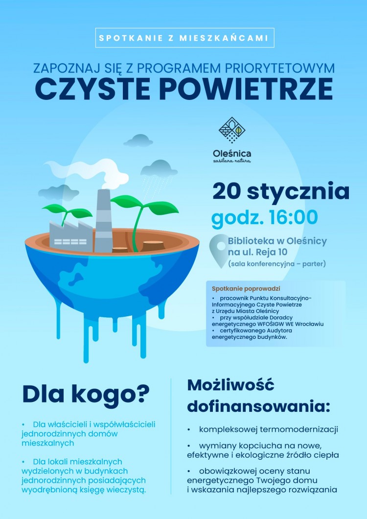 Czyste Powietrze. Zaproszenie na wtorkowe spotkanie w Oleśnicy