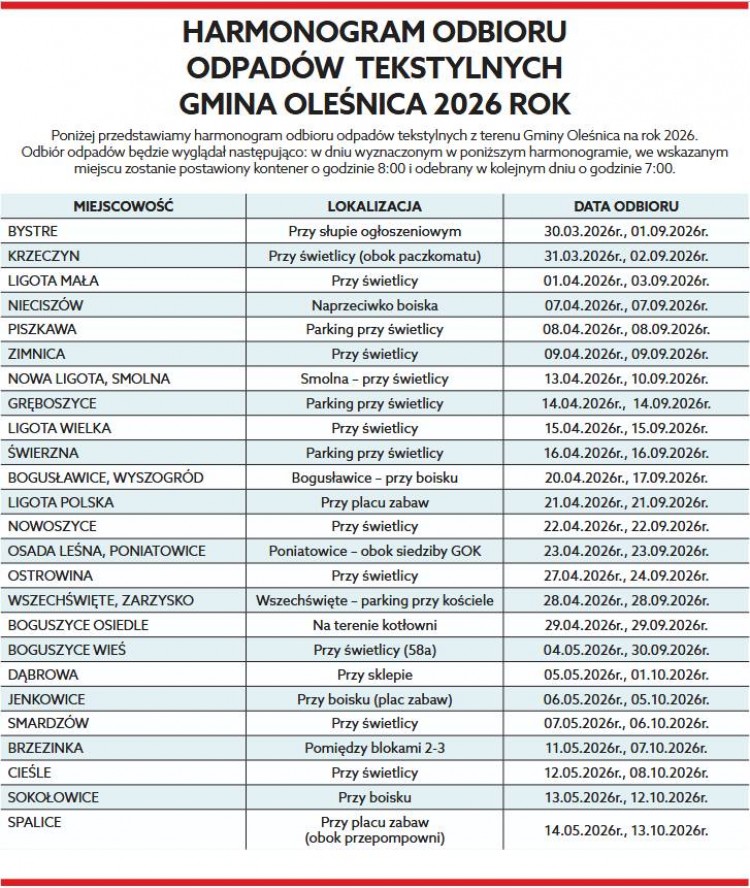 - Przypominamy harmonogram odbioru odpadów tekstylnych z terenu gminy Oleśnica na 2026 rok! Znajdą go Państwo również w grudniowym wydaniu Kuriera Gminy Oleśnica - informuje Urząd Gminy Oleśnica.