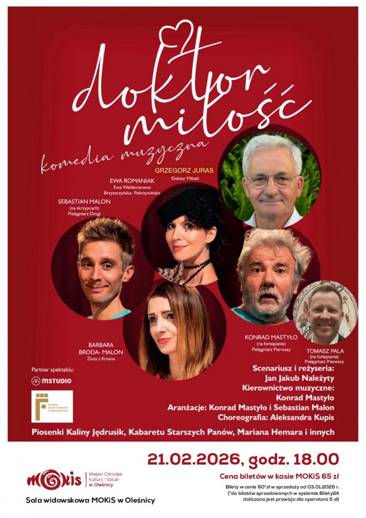 - Zapraszamy na spektakl kabaretowo-muzyczny ,,Doktor Miłość", który odbędzie się w 21 lutego 2026 o godz. 18.00 w sali widowiskowej MOKiS. Bilety w cenie 62*zł w sprzedaży od 03.01.2026 r. (*do biletów sprzedawanych w systemie Bilety24 doliczana jest prowizja dla operatora 3 zł). Cena biletów w kasie MOKiS 65 zł - informuje MOKiS.