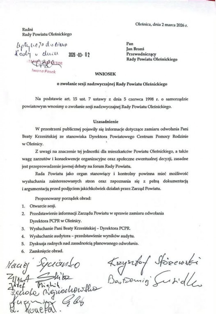 Realizując uprawnienia kontrolne Rady Powiatu Oleśnickiego, dziś w Biurze Rady złożyliśmy wniosek o zwołanie sesji nadzwyczajnej w sprawie zamiaru odwołania Pani Beaty Krzesińskiej ze stanowiska Dyrektora Powiatowego Centrum Pomocy Rodzinie w Oleśnicy.