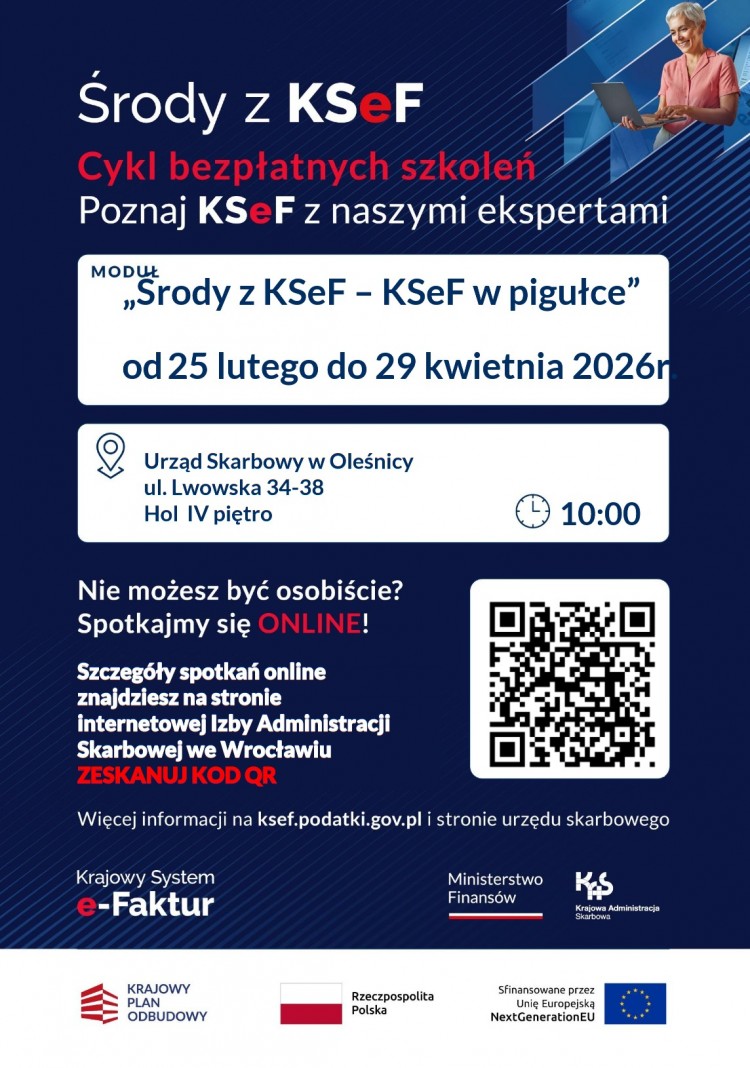 Urząd Skarbowy w Oleśnicy zaprasza na organizowane co środę spotkania dotyczące KSeF. Szczegóły na plakacie.
