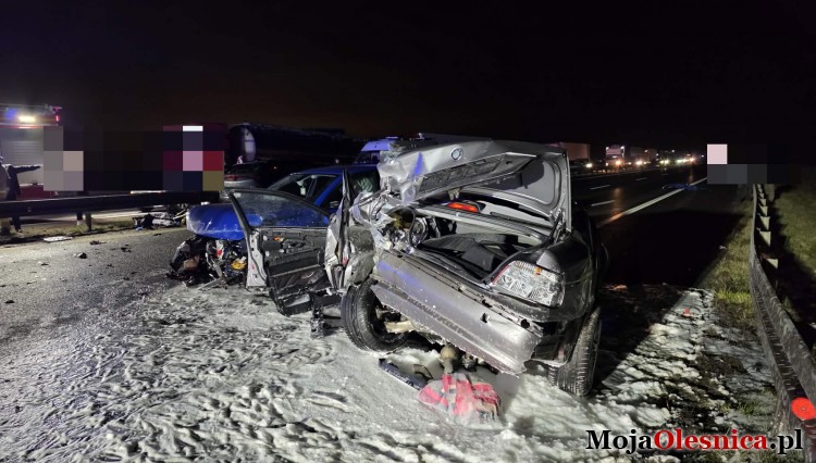 - W wyniku zdarzenia drogowego, które miało miejsce około godziny 19:25, doszło do zablokowania trasy w obu kierunkach. Na jezdni znajdują się rozrzucone elementy karoserii pojazdów uczestniczących w wypadku, co uniemożliwia obecnie przejazd. Niestety, w wyniku zdarzenia jedna osoba poruszająca się pojazdem marki BMW poniosła śmierć na miejscu. Dwie pozostałe osoby zostały przetransportowane do placówki medycznej w celu przeprowadzenia dalszej diagnostyki i udzielenia niezbędnej pomocy. Na miejscu pracują policjanci, którzy zabezpieczają teren i prowadzą czynności wyjaśniające okoliczności zdarzenia. Kierowców prosimy o zachowanie szczególnej ostrożności oraz korzystanie z alternatywnych tras - przekazała mł. asp. Karolina Walczak z oleśnickiej policji.
