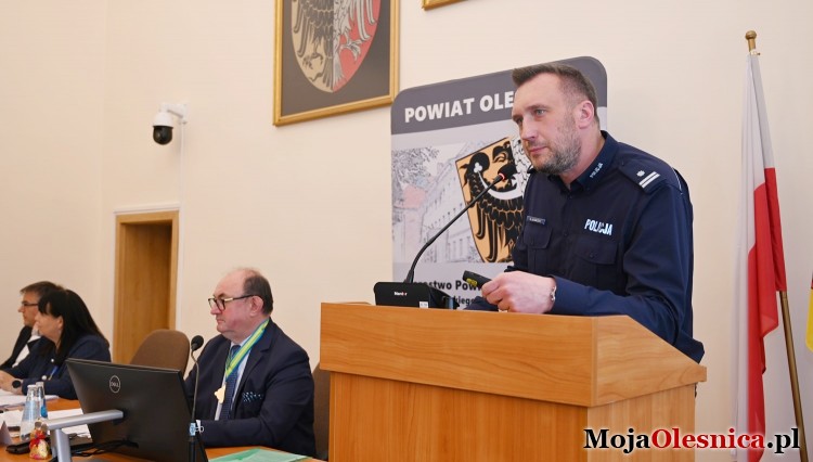Sprawozdanie Komenda Powiatowa Policji w Oleśnicy przedstawił komendant powiatowy Rafał Adamczyk. W swoim wystąpieniu odniósł się do poziomu przestępczości, działań prewencyjnych oraz codziennej pracy funkcjonariuszy. Podkreślił także znaczenie współpracy z samorządem. Przypomniał, że Powiat przekazał 95 tys. zł na dofinansowanie oznakowanego furgonu patrolowego, a także 8 tys. zł na działania profilaktyczne, w tym nagrody w konkursach edukacyjnych oraz materiały promujące bezpieczeństwo.