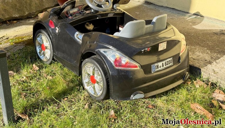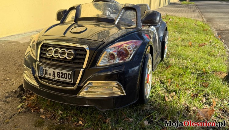 Przed budynkiem Starostwa Powiatowego w Oleśnicy znaleziono elektryczny samochodzik dla dzieci. Pojazd jest koloru czarnego, z emblematem Audi, posiada srebrne felgi oraz dwuosobowe siedzisko.