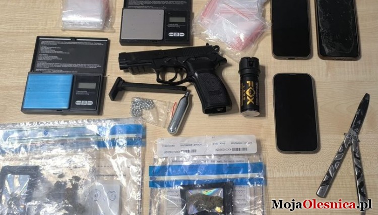 W krótkim czasie funkcjonariusze zauważyli samochód odpowiadający przekazanym informacjom. Pojazd został natychmiast zatrzymany do kontroli drogowej. W jego wnętrzu znajdowało się dwóch mężczyzn odpowiadających rysopisowi sprawców. W pojeździe ujawnili telefon komórkowy należący do pokrzywdzonego. Dodatkowo podczas przeszukania zabezpieczono kolejne dowody świadczące o popełnieniu przestępstwa takie jak użyty nóż, gaz czy przedmiot przypominający broń. W toku dalszych czynności przy 17-letnim mężczyźnie ujawniono 35 porcji marihuany. Zabezpieczono również wagę elektroniczną oraz inne służące do popełnienia przestępstw przedmioty.