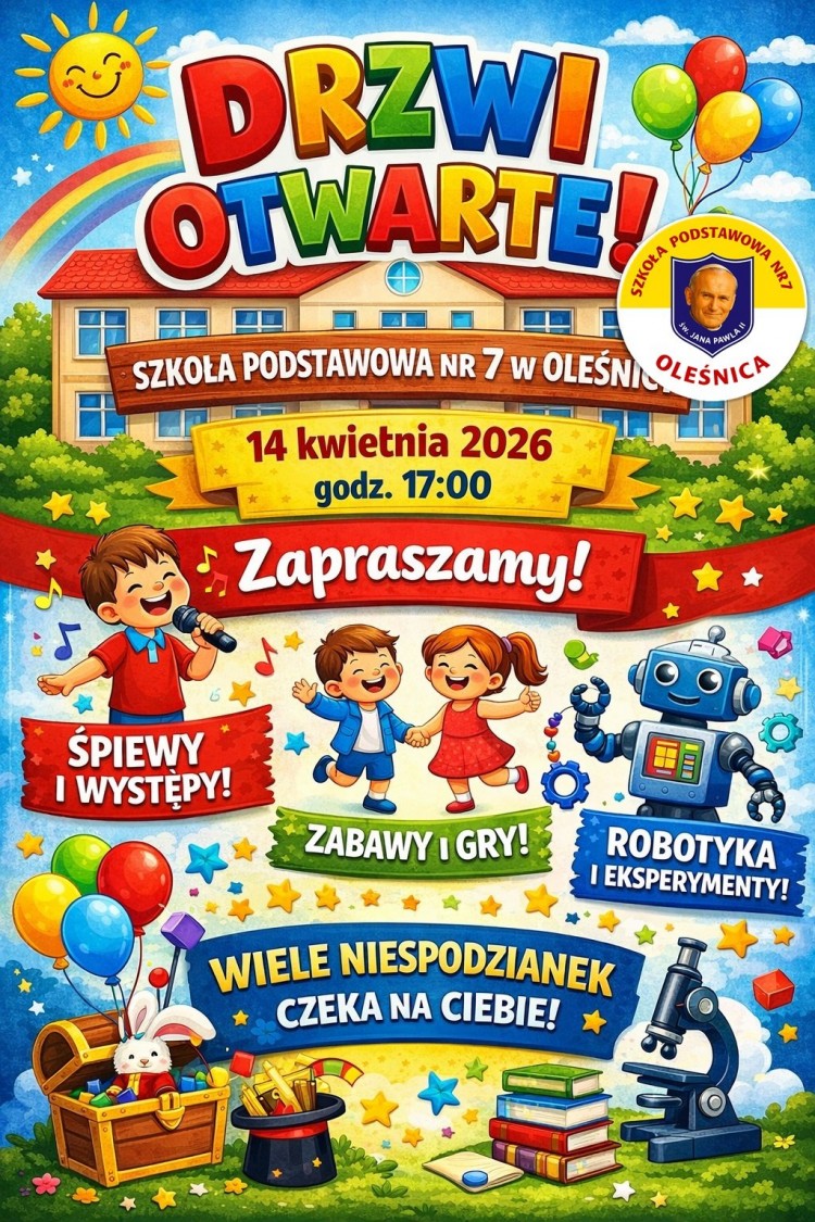 Dzisiaj Szkoła Podstawowa nr 7 im. Jana Pawła II w Oleśnicy otworzy swoje drzwi. Szczegóły na plakacie.