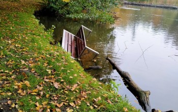 Ktoś wyrzucił parkową ławkę do stawu! Kolejny akt wandalizmu