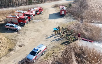 Ćwiczenia straży pożarnej w Stradomi. Lód zawsze jest niebezpieczny!